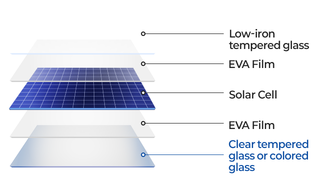 It is a building-integrated photovoltaic (BIPV) module made of glass on both the front and back, which functions as a building exterior material along with solar power generation functions. It can transmit light to the interior or implement various colors and patterns, so it can achieve architectural design effects and energy production at the same time. It has the characteristic of combining natural light and electricity production when applied to ceilings or curtain walls.
